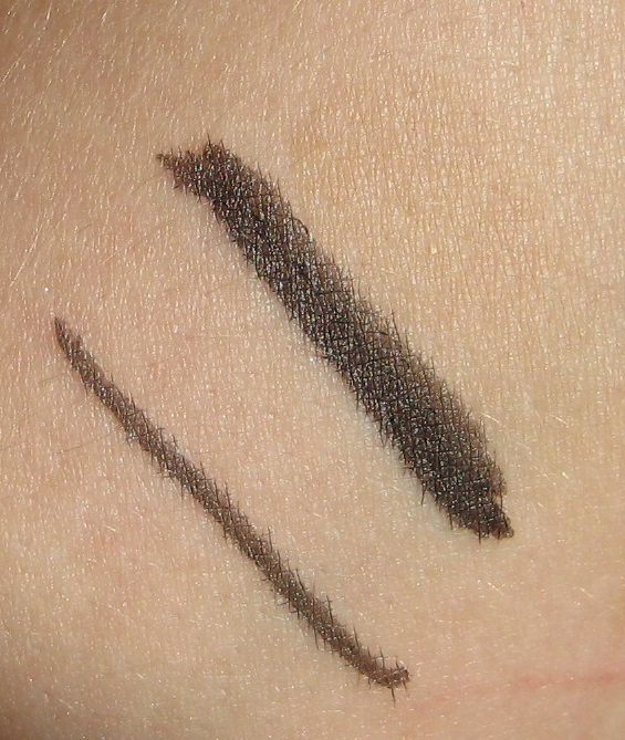 The bottom swatch is one swipe to show how thin you can get. The top is to show how dark you can get the color. You can see a bit of feathering on my arm, but I have never experienced this on my eye. The Le Metier artists typically recommend a tapping method to apply this liner to get the best line. One of their artists, Kayla, shows the liner technique in this video. I find this technique to be my favorite for easy application, but my mother (who has also fallen in love with this pen), prefers to drag it along her lash line.